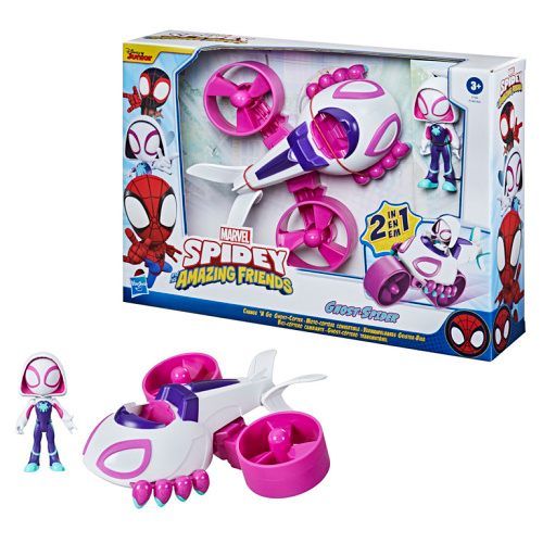 S tímto konvertovacím vozidlem ze seriálu Spider-Man a jeho úžasní přátelé na vás čeká dvojitá dávka dobrodružství! Každé vozidlo a figurka v této sadě funguje na bázi 2 v 1. Stejně jako v seriálu na Disney Junior se tato vozidla dokážou v mžiku proměnit na něco úplně jiného, a našim hrdinům tak poslouží při jejich nekonečných dobrodružstvích! V sadě najdete figurku Spider Gwen a její helikoptéru, která se může proměnit na motorku, Spider-Mana a jeho závodní auto, které se může proměnit na šplhající stroj, a Milese Moralese a jeho terénní tříkolku, která se může proměnit v závodní člun. Zahrnuje figurku a vozidlo.