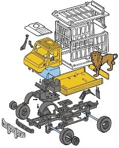 Model Mercedes Unimog MS 51 Safari v měřítku 1:48 malý náklaďáček s klecí pro převoz zvířat. Stavebnice patří do skupiny Standard.