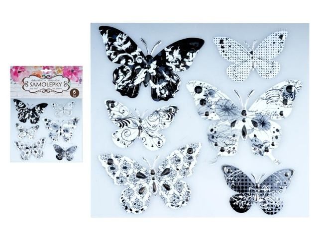 Pokojová samolepící dekorace - černobílí motýli se stříbrnou ražbou - na stěny, dveře, okna, zrcadla a jiné hladké plochy. Tato samolepka na zeď v mžiku oživí Váš obývací pokoj, koupelnu, chodbu, dětský pokoj či ložnici. NÁVOD: Opatrně sejměte samolepku z podkladového papíru a umístěte ji na zvolenou suchou, čistou a rovnou plochu. Samolepku vyhlaďte od středu ke krajům tak aby pod ní nezůstali žádné vzduchové bubliny. Uvedená cena je za 1 ks.