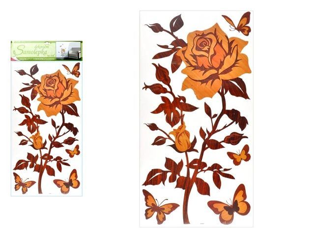 Pokojová samolepící dekorace - růže s imitací dřeva - na stěny, dveře, okna, zrcadla a jiné hladké plochy. Tato samolepka na zeď v mžiku oživí Váš obývací pokoj, koupelnu, chodbu, dětský pokoj či ložnici. NÁVOD: Opatrně sejměte samolepku z podkladového papíru a umístěte ji na zvolenou suchou, čistou a rovnou plochu. Samolepku vyhlaďte od středu ke krajům tak aby pod ní nezůstali žádné vzduchové bubliny. Uvedená cena je za 1 ks.