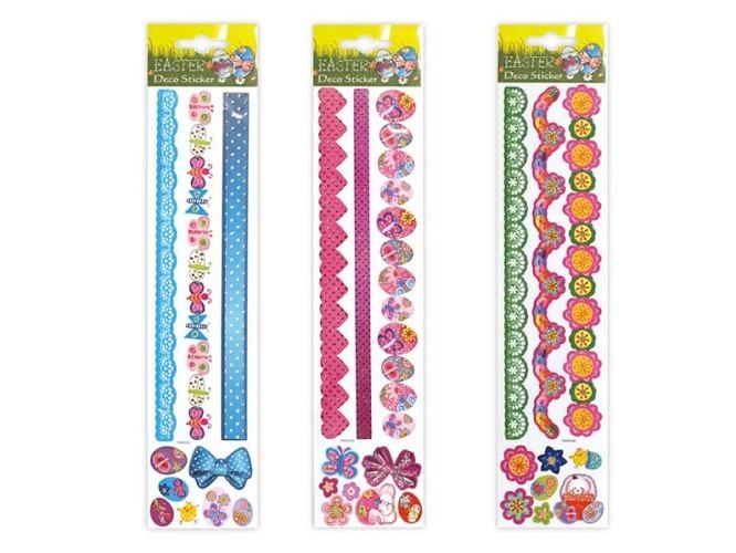 Dekorační samolepky na velikonoční vejce. Rozměr 27 x 7 cm. Jak nalepit samolepku na vejce: Vezměte si vyfouknuté, suché a odmaštěné vejce, přilepte na něho samolepku a dozdobte oboustranně lepící nálepkou a obrázky.