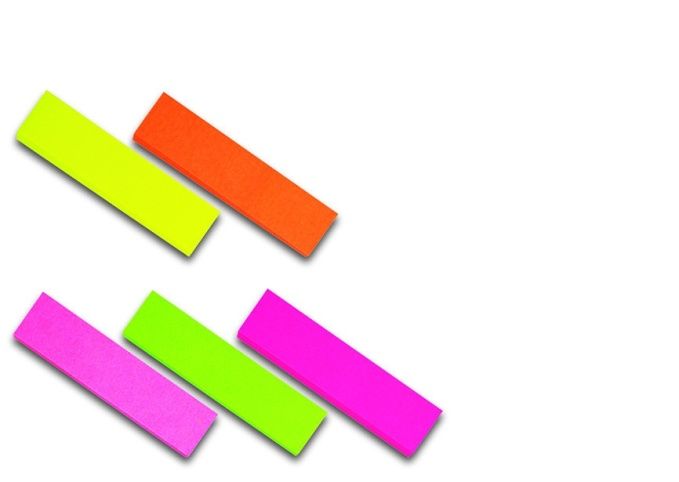 Neonové papírové samolepicí záložky. 5 barev x 100 lístků - zelená, žlutá, oranžová, růžová, tmavě růžová. Snadno odstranitelné - nezanechávají stopy. Rozměr 12 x 50mm.