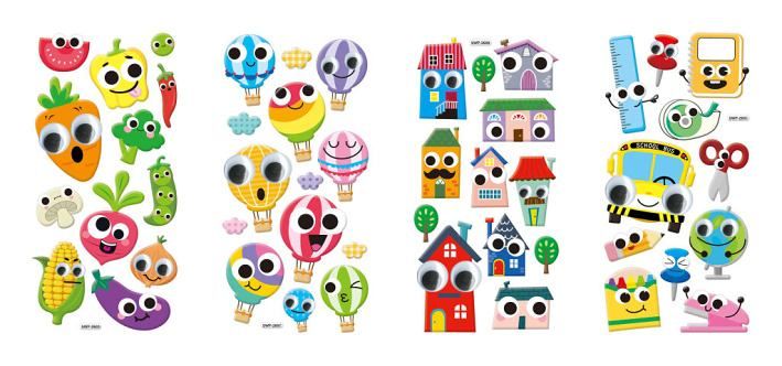 Barevné samolepky Googly Eyes, celé balení obsahuje mix 4 vzorů. Balení 12 ks.