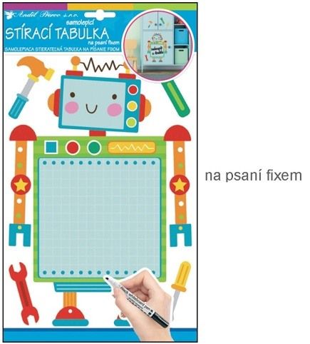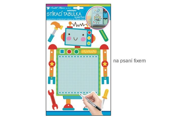 Samolepka tabulka na psaní fixem robot 30x21cm Snadné použití! Vhodné na stěny, okna, zrcadla, kachličky a jiné hladké plochy! NÁVOD: Opatrně sejměte samolepku z podkladového papíru a umístěte ji na zvolenou suchou a čistou plochu. Vyhlaďte od středu ke krajům.
