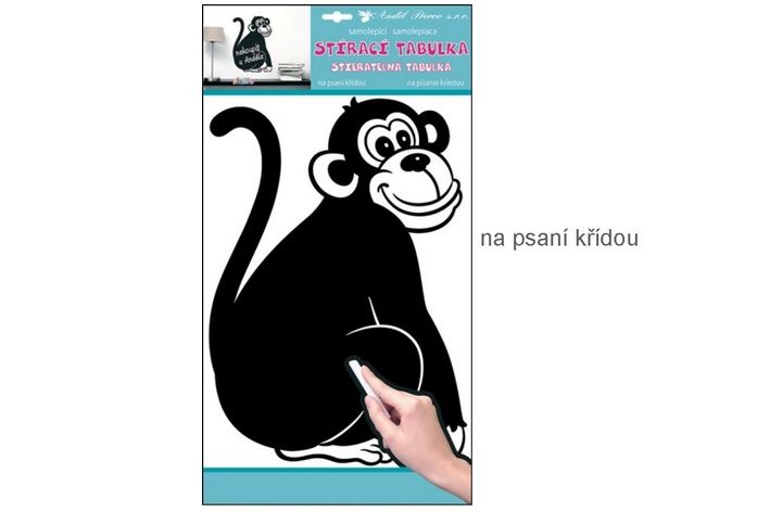 Samolepka tabulka na psaní křídou opice 40x29cm Snadné použití! Vhodné na stěny, okna, zrcadla, kachličky a jiné hladké plochy! NÁVOD: Opatrně sejměte samolepku z podkladového papíru a umístěte ji na zvolenou suchou a čistou plochu. Vyhlaďte od středu ke krajům.
