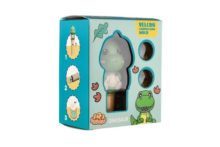 Roztomilé razítko ve tvaru dinosaura je skvělou kreativní hračkou pro všechny malé milovníky pravěkých tvorů. Součástí balení jsou také samolepková kolečka s různými dinosaury a tematický arch, na který si mohou děti samolepky nalepovat.
