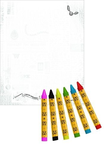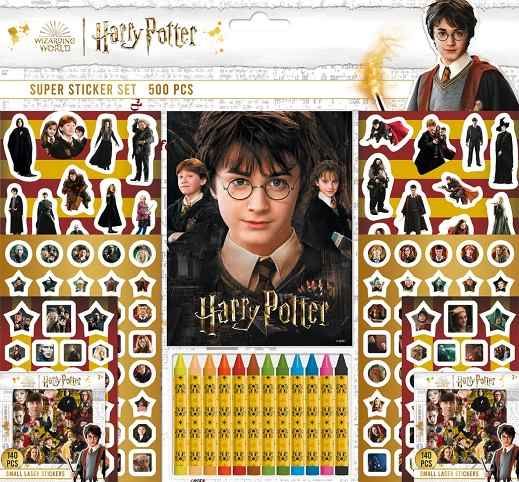 Set obsahuje téměř 500 různých druhů samolepek, blok (32 listů) ke psaní i malování a 12 voskovek. Tento velký samolepkový set obsahuje více než 500 samolepek s motivy oblíbených postav a scén z kouzelnického světa. Součástí balení je také blok s obálkou Harry Potter a sada 12 voskovek, se kterými si děti mohou vytvářet vlastní magické obrázky.
