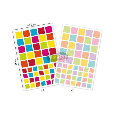 Samolepky Maildor Inital s různými barvami a velikostmi čtverců. Balení obsahuje 4 listy, 2 motivy po 2 ks. Samolepky lze sloupnout a znovu nalepit. Rozměry balení: 10,5 x 16 cm.