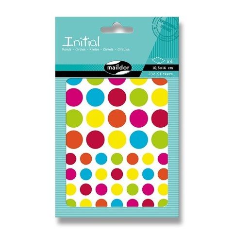 Samolepky Maildor Inital s různými barvami a velikostmi koleček. Balení obsahuje 4 listy, 2 motivy po 2 ks. Samolepky lze sloupnout a znovu nalepit. Rozměry balení: 10,5 x 16 cm.