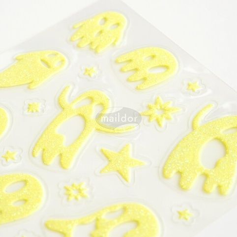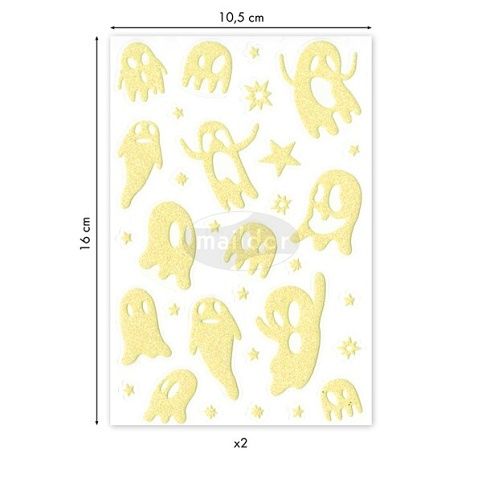 Samolepky Maildor Initial Phospho s motivy duchů v třpytivém a ve tmě fosforeskujícím provedení. Balení obsahuje 2 listy, 2 motivy po 1 ks. Samolepky lze sloupnout a znovu nalepit. Rozměry balení: 10,5 x 16 cm.
