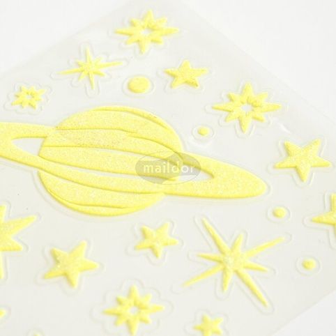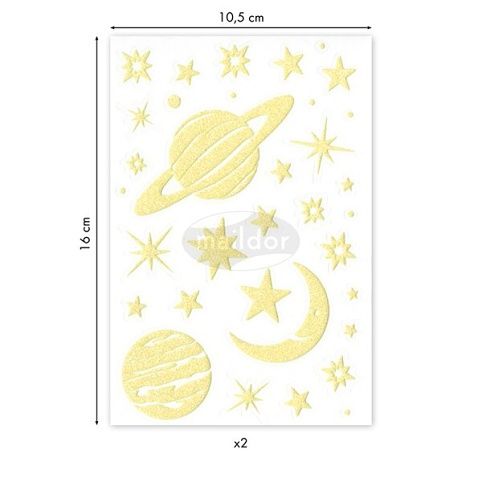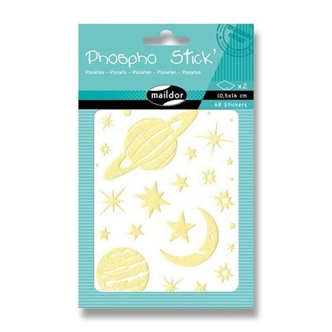 Samolepky Maildor Initial Phospho s motivy planetek v třpytivém a ve tmě fosforeskujícím provedení. Balení obsahuje 2 listy, 2 motivy po 1 ks. Samolepky lze sloupnout a znovu nalepit. Rozměry balení: 10,5 x 16 cm.