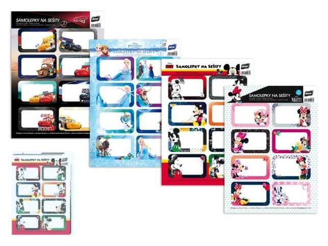 Samolepky na sešity s obrázky z pohádek od Walt Disney, aršík obsahuje 8 různých motivů samolepek k polepení sešitů. Na samolepkách najdete obrázky z pohádek Cars (Auta), Frozen (Ledové království), Mickey Mouse, a Minnie Mouse. Každá samolepka obsahuje 4 řádky, kde můžete například napsat jméno a příjmení, předmět, název školy, třídu. Nálepky jsou k dostání ve čtyřech variantách. Rozměr Archu: A5 Rozměr štítku: 66 x 41 mm