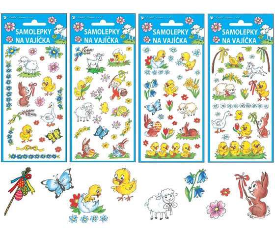 Gelové samolepky vhodné na zdobení vajíček- mix motivů- rozměr archu: 19 x 9cm