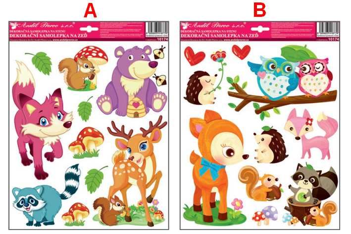Samolepky na zeď lesní zvířátka 33 x 29 cm Snadné použití! Vhodné na stěny, okna, zrcadla, kachličky a jiné hladké plochy! NÁVOD: Opatrně sejměte samolepku z podkladového papíru a umístěte ji na zvolenou suchou a čistou plochu. Vyhlaďte od středu ke krajům. Cena za 1 kus, dodáváme v mixu motivů.