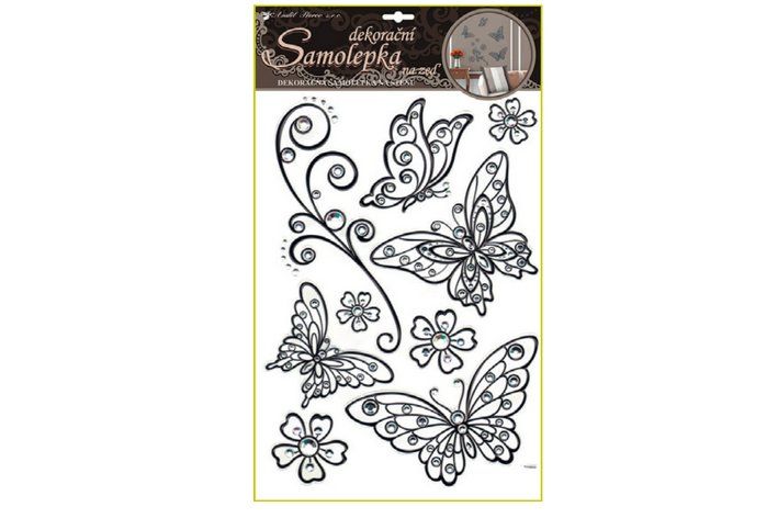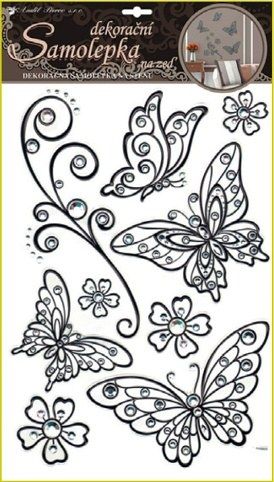 Samolepky na zeď motýli s černou konturou a kamínky plastická 49x29cm. Snadné použití! Vhodné na stěny, okna, zrcadla, kachličky a jiné hladké plochy! NÁVOD: Opatrně sejměte samolepku z podkladového papíru a umístěte ji na zvolenou suchou a čistou plochu. Vyhlaďte od středu ke krajům.