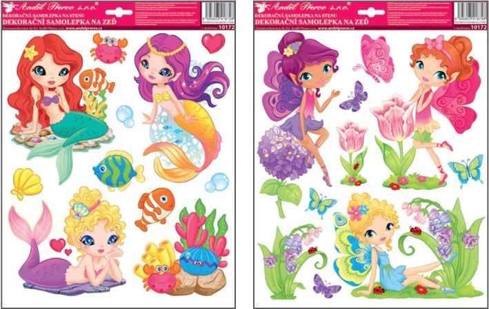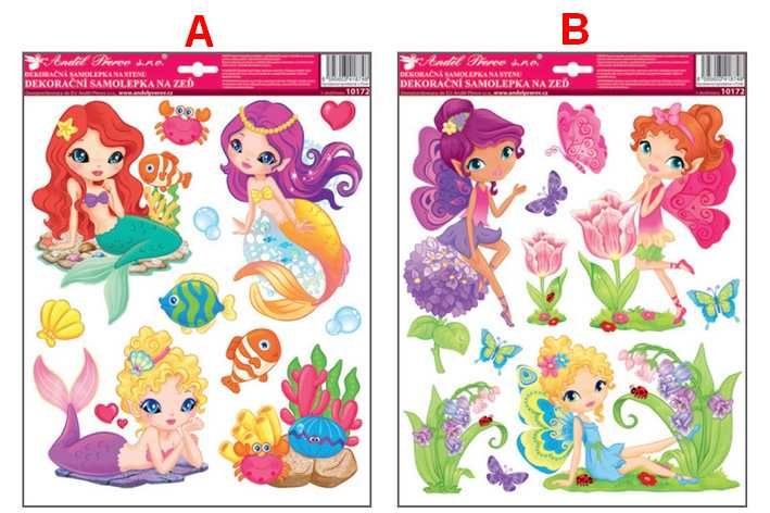 Samolepky na zeď víly, mořské víly 33 x 29 cm Snadné použití! Vhodné na stěny, okna, zrcadla, kachličky a jiné hladké plochy! NÁVOD: Opatrně sejměte samolepku z podkladového papíru a umístěte ji na zvolenou suchou a čistou plochu. Vyhlaďte od středu ke krajům. Cena za 1 kus, dodáváme v mixu motivů.
