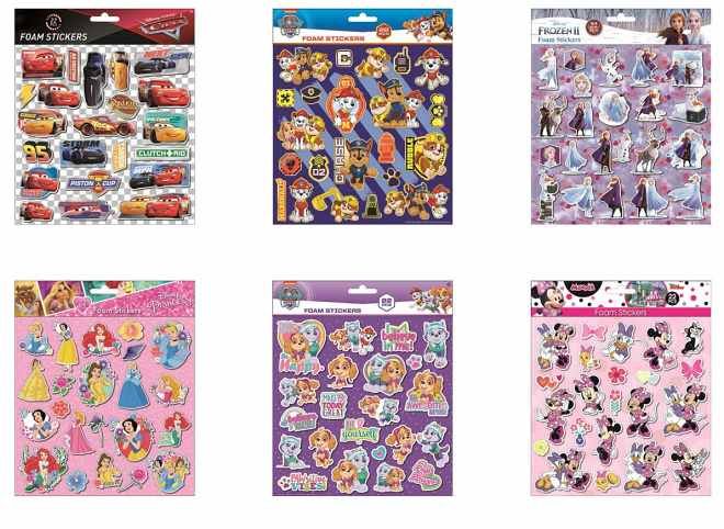 Samolepky pěnové 22 kusů 24x20,5 cm 6 druhů (The Cars, Paw Patrol, Princezny, Minnie, Frozen 2). Nelze vybrat druh, dodáváme dle skladové dostupnosti.