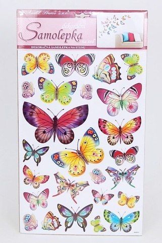 Samolepky na zeď barevní motýli 48x29cm Snadné použití! Vhodné na stěny, okna, zrcadla, kachličky a jiné hladké plochy! NÁVOD: Opatrně sejměte samolepku z podkladového papíru a umístěte ji na zvolenou suchou a čistou plochu. Vyhlaďte od středu ke krajům.