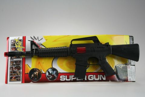 Platový samopal o velikosti cca 43 cm, při zmáčkutí rachtá, jiskří. Věk 3+
