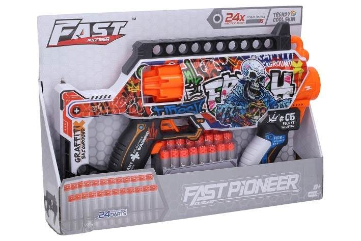 Samopal na pěnové náboje revolver. Rozměry 35x7x20,5 cm. Obsah balení - samopal, 24 pěnových nábojů. Baterie 4xAA, nejsou součástí balení (přihrádka na levém boku zbraně).