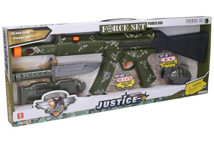 Samopal s efekty, délka 59 cm. Se světelnými a zvukovými efekty obsahuje také nůž s pouzdrem a granát s efekty. zbraň - 3xAA, granát - 2xAG13, obojí součástí.