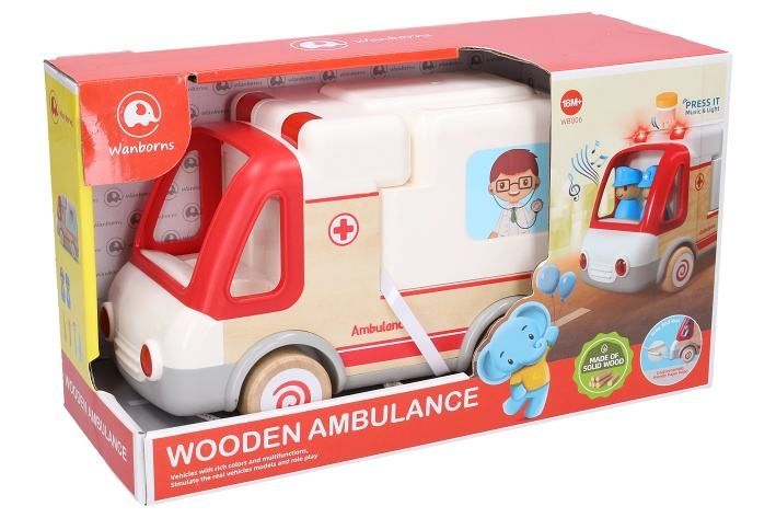 Sanitka dřevo/plast s efekty 21cm. Světelné a zvukové efekty. Baterie 3xAG13 součástí. Provázek na tahání autíčka.