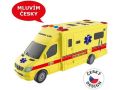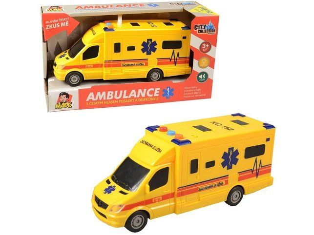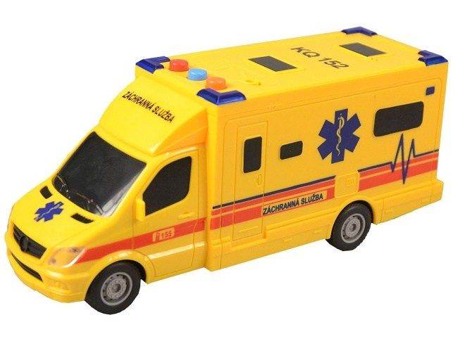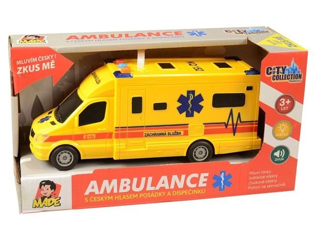 Skvělá hračka pro kluky i holky je skříňová dodávka Zdravotnické záchranné služby v českém designu. Auto po stisknutí tlačítka simuluje hlášení mezi posádkou ambulance a dispečinku. DISPEČINK: Požár na Hlavním nádraží. Jsou hlášeny otravy kouřem. Všechny posádky v terénu k zásahu. POSÁDKA: Voláme dispečink. Je zde více raněných. Pošlete sem další posily. POSÁDKA: Pacienta se nám podařilo stabilizovat. Odvážíme ho do nemocnice. Součástí je funkční maják. Pohon na setrvačník. Auto je napájeno bateriemi 3x AG13 (jsou součástí balení). Velikost auta cca 19 cmVhodné pro děti od 3 let