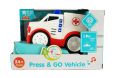 Plastové auto, velikost 15 cm. 3 zvuky, startování, houukání a zvuk motoru. Při stalečení majáku auto jede a maják svítí.
