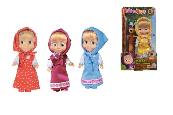 Panenka Máša z dětského seriálu "Máša a medvěd". 4 druhy lišící se barevným oblečením. Výška panenky 12 cm.
