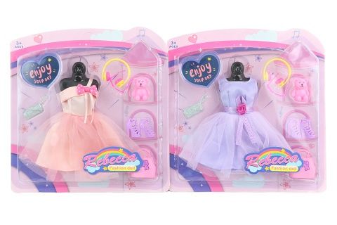 Šatičky pro panenku s doplňky - střevíčky, 2x kabelka, medvídek a sluchátka. Rozměry šatů cca 14,5 x 12 cm. Rozměry balení cca 23 x 24 x 2,5 cm. Věk 3+