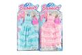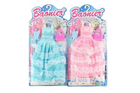 Šatičky pro panenku. Balení obsahuje také střevíčky, náhrdelník, kabelku a hřebínek. Materiál polyester a plast. Rozměry balení cca 17x35x3,5 cm. Rozměry šatiček cca 23x14 cm. Věk 3+