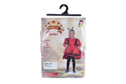Karnevalový kostým berušky pro děti o velikosti 80-92 cm. Balení obsahuje šaty, křídla a čelenku. Materiál polyester+plast. Rozměry balení cca 30x48x1 cm.