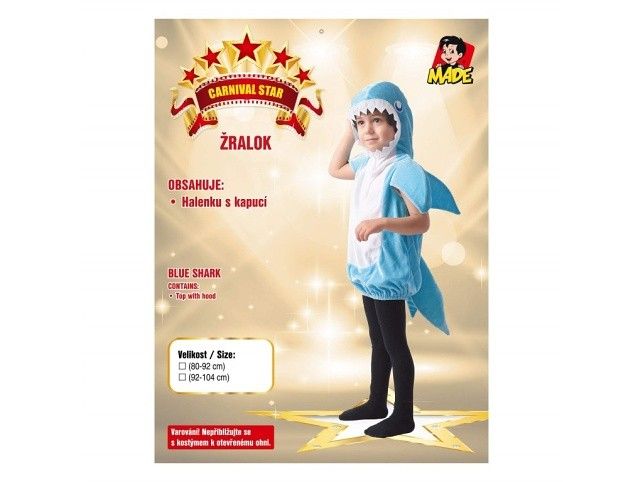 Šaty na karneval pro malé děti - žralokVelikost: 92 - 104 cmKostým obsahuje: Žraločí top s kapucíChystáte se s dítětem na karneval, dětskou párty nebo na významnou kostýmovou událost ve škole či školce? Potom je na místě důkladný výběr vhodného kostýmu. Zkuste se zamyslet, jaký konkrétní převlek vystihne dětskou osobnost, významnou vlastnost, jaký kostým vašemu dítěti bude nejvíce slušet. Bude to kostým komiksového hrdiny, pohádkový kostým, převlek znázorňující nějaké povolání anebo krásné šaty pro princeznu? Při výběru kostýmů a tvorbě případných doplňku zažijete s dítětem spoustu zábavy. Odměnou vám i vašemu dítěti bude radost a spousta zážitků. Staňte se společně hvězdou karnevalu.