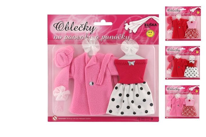 Šaty/Oblečky - šaty, kabátek a čepice na panenky mix druhů na kartě 22x21cm