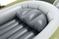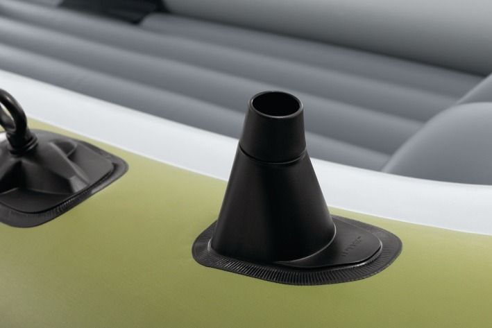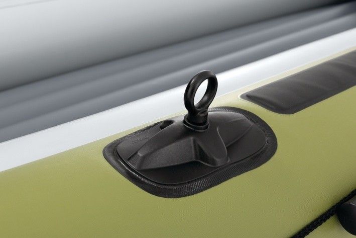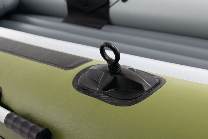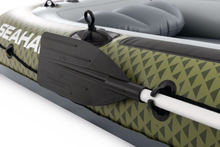 Nafukovací člun Seahawk™ 4 je navržen tak, aby poskytoval pohodlný a bezpečný zážitek na vodě pro až čtyři osoby. Člun má robustní konstrukci z odolného PVC materiálu, který je odolný vůči poškození, nárazům i oděru, což zajišťuje dlouhou životnost i při častém používání na řekách, jezerech nebo moři. Vnější část člunu je laděna do kombinace zelených a šedých odstínů s jemným vzorem trojúhelníků, což mu dodává moderní a outdoorový vzhled. Vnitřní prostor je světlý šedý a nabízí nafukovací sedáky zajišťující větší komfort během plavby. Člun je vybaven třemi samostatnými vzduchovými komorami, včetně pomocné komory uvnitř hlavního trupu, která zvyšuje bezpečnost při plavbě. Nafukovací podlaha s I-nosníkovou konstrukcí zajišťuje stabilitu a pevnost, což oceníte při delších výletech nebo rybaření. Díky dvěma bostonským ventilům lze člun rychle nafouknout i vyfouknout, což usnadňuje přepravu a skladování. Pro pohodlné ovládání jsou na bocích připevněny dva rotační zámky na vesla, která lze jednoduše upevnit do držáků. Součástí balení jsou dvě lehká hliníková vesla a pumpa, která umožní snadné nafouknutí člunu. Po celém obvodu člunu je upevněno lano pro lepší manipulaci a bezpečnost, zatímco na přídi je pevné svařené madlo pro snadné uchopení. Člun je také vybaven dvěma integrovanými držáky na rybářské pruty a praktickým pouzdrem na vybavení, což z něj činí ideální volbu pro rybáře. Na zádi člunu jsou připraveny přípojky pro připevnění motoru, což rozšiřuje možnosti využití zejména pro delší výlety nebo rychlejší plavbu. Celkově Seahawk™ 4 nabízí kombinaci funkčnosti, komfortu a bezpečnosti, což z něj činí všestranný nafukovací člun vhodný pro rodinné i sportovní využití.