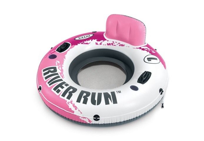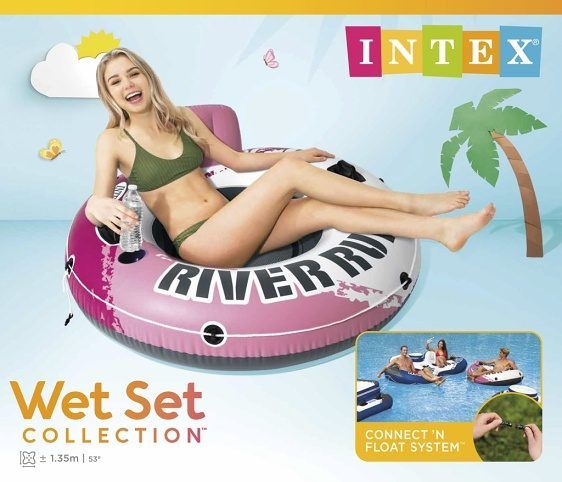 Nafukovací sedátko do vody o průměru 1,35m. Síťové dno. Opěrátko pro pohodlné sezení. 2 vzduchové komory, 2 držadla, 2 držáky na pití. Lano po celé délce nafukovačky. Opravná náplast přiložena.