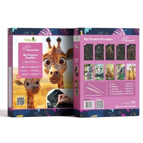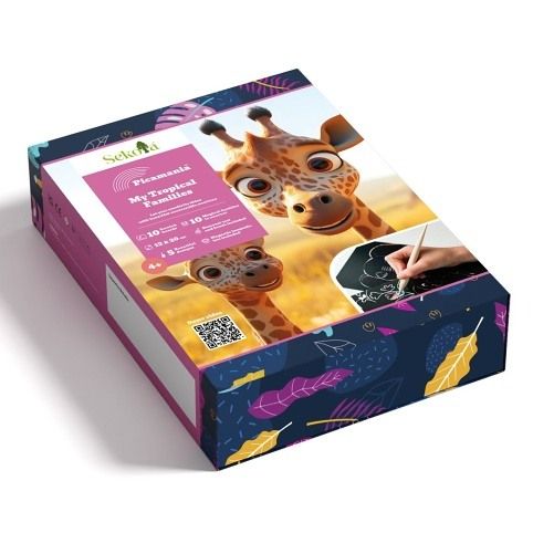 Vstupte do hravého světa africké savany a tropické džungle s touto sadou, která dětem umožní vytvořit 10 nádherných obrázků rodinek tropických zvířat, jako je žirafa, panda, slon, koala a lev. Pomocí přiloženého dřevěného rydla budou děti postupně stírat černou krycí vrstvu a odhalovat barevné obrázky zvířat. Každý obrázek se tak promění v oslnivé umělecké dílo plné detailů a lesku. Sada podporuje rozvoj jemné motoriky, soustředění i kreativity a nabízí klidnou a zábavnou tvořivou činnost pro všechny milovníky exotických zvířat. Práce je snadná díky přiloženým nástrojům. Obsah balení: 10 pevných obrázkových předloh (5 designů po 2 ks), nástroj na odstraňování černé vrstvy, magnetická krabička, štětec a návod s QR kódem pro demo video. Vhodné pro děti od 4 let.