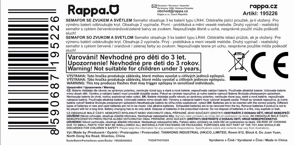 Senzační semafor se světelným a zvukovým efektem. Semafor vyžaduje použití 3 ks baterií typu LR44, které jsou součástí výrobku. Výška semaforu je cca 13 cm.