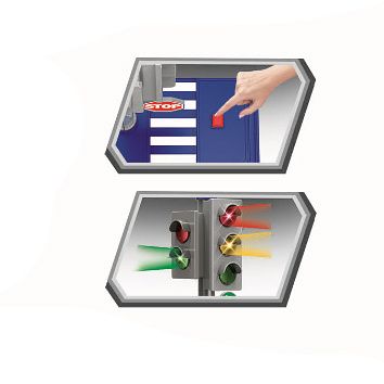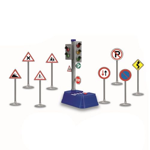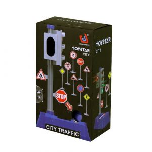 Semafor svítí, bliká a vydává zvuk. Funguje na 2x1.5 V AA baterie. V sadě jsou také dopravní značky.