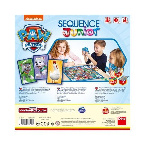 Obli‚bena‚ hra Sequence tentokra‚t pro nejmensˇi‚ hra‚cˇe s kamara‚dy z Tlapkove‚ patroly. Zahrajte kartu z ruky a umi‚steˇte zˇeton na odpovi‚daji‚ci‚ obli‚benou postavicˇku Tlapkove‚ patroly na herni‚m pla‚nu. Zahrajte specia‚lni‚ karty a prˇekazte pla‚ny souperˇu°! Kdo prvni‚ sestavi‚ 4 zˇetony v rˇadeˇ, vyhra‚va‚ hru. Hra pro 2–4 hráče.
