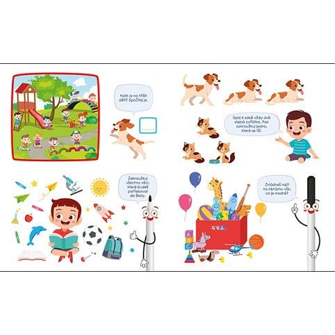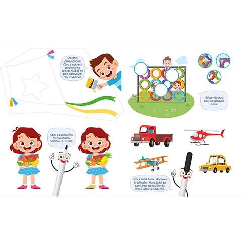 Titul obsahuje 22 stíratelných stran s úkoly pro trénování předškolních dovedností. Fix je součástíbalení.