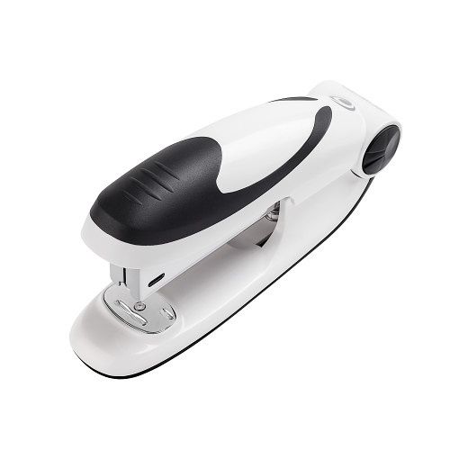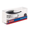 Sešívačka č.24/6 rmalá, plastová s kovovými/gumovými částmi, ergonomický tvar, s náplní 50-ti drátků, variabilní sešívací patka pro sešití z vnitřní nebo vnější strany, horní nakladač, černá/bílá
