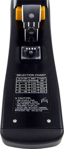 Celokovová konstrukce s předním nabíjecím mechanismem, protiskluzová základna, nastavitelná zarážka papíru se zámkem, sešívací rameno s gumovými body, otočné kopyto pro různé velikosti sponek, zásobník na náhradní sponky. drátky: 23/6 - 23/13 kapacita: až 120 listů hloubka vložení: až 70 mm