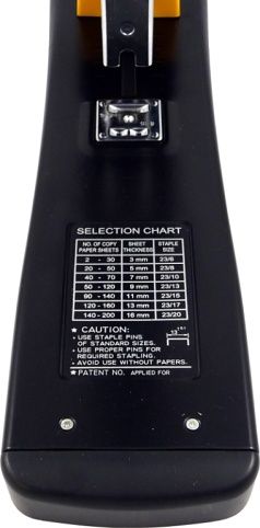 Celokovová konstrukce s předním nabíjecím mechanismem, protiskluzová základna, nastavitelná zarážka papíru se zámkem, sešívací rameno s gumovými body, otočné kopyto pro různé velikosti sponek, zásobník na náhradní sponky. drátky: 23/6 - 23/20 kapacita: až 200 listů hloubka vložení: až 70 mm