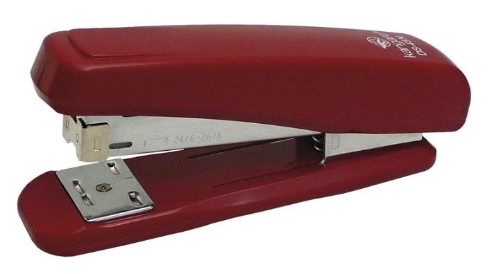 kovová sešívačka červené barvy se zesílenou plastovou základnou