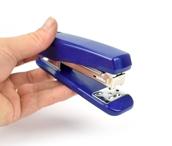 kovová sešívačka modré barvy se zesílenou plastovou základnou