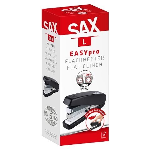SAX 559 sešívačka L s technologií SAX EASYpro. Bezproblémové sešívání s minimální silou – ideální na váš stůl, ať už v kanceláři nebo doma. S mechanismem horního plnění, a full-strip hloubkou sešívání 68 mm . Technologie plochého sešívání zajišťuje extra ploché sešívání – ideální pro úsporu místa při archivaci. Malá pryžová nožička pod kovadlem poskytuje základní protiskluzovou oporu. Kapacita: až 25 listů se sponkami 24/6 nebo 26/6.