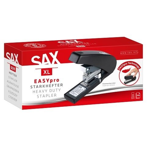 SAX 659 sešívačka XL s technologií SAX EASYpro. Odolná konstrukce pro vysokovýkonné sešívání v kanceláři. Bezproblémové sešívání – i pro velké stohy papíru. S mechanismem horního plnění a nastavitelnou hloubkou sešívání od 10 do 50 mm. Vestavěný systém uvolňování zaseknutých spon umožňuje snadné odstranění zaseknutých spon. Malá pryžová nožička pod kovadlem poskytuje základní protiskluzovou oporu. Kapacita: až 100 listů se sponkami 24/6, 23/8, 23/10 nebo 23/13.