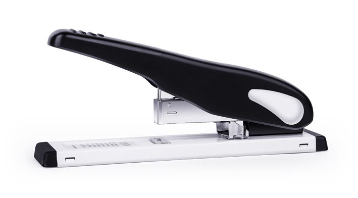 Velkokapacitní bloková sešívačka do 100 listů. Vhodná do kanceláře i kopírovacích center. Opatřená štítkem: typ drátku - počet listů. Robustní kovová základna. Plastové dno základny, které zabraňuje poškození nábytku. Možnost regulace hloubky vkládání 6-55mm.