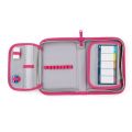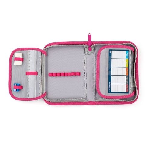 Penál: Jednopatrový školní penál se dvěma chlopněmi bez náplně. Gumová poutka k uchycení psacích potřeb. Na vnitřní chlopni je průhledná fólie pro rozvrh hodin.